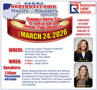 The Northwest Ohio Mayors and Managers Association would like to invite you to join us for our Annual Steak Dinner on Tuesday, March 24, 2026, 5:30PM at the American Legion Freedom Post#183 (Riverview Banquet Centre) 405 East Front Street Pemberville, Ohio 43450.
